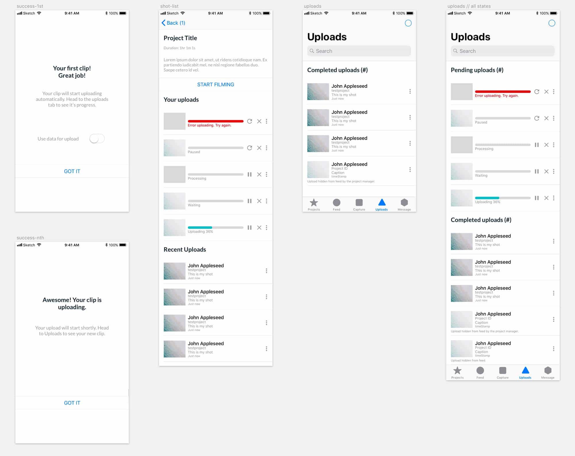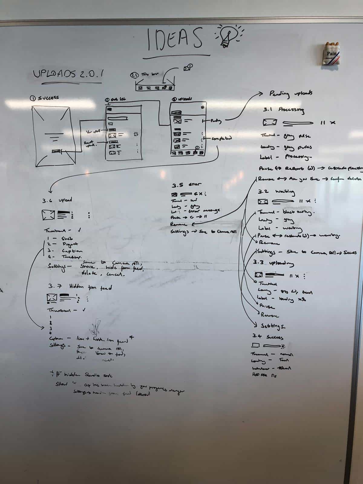 Post launch, I carried out a number of user tests to identify potential pain points for users. A common theme for users was not being certain if their upload had completed and where they could see said content. With a trusty whiteboard and pen, I put together the high level information architecture and from there some basic sketches of the user flow. It became apparent that once content has begun to upload, users should see its progress immediately, as well as being given control over its state (pause, stop, start).